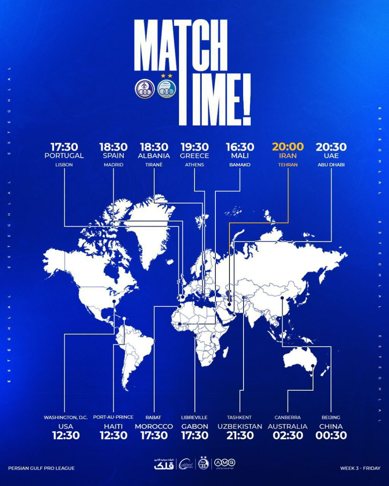 🔵 زمان پخش بازی استقلال خوزستان و استقلال در کشورهای مختلف جهان