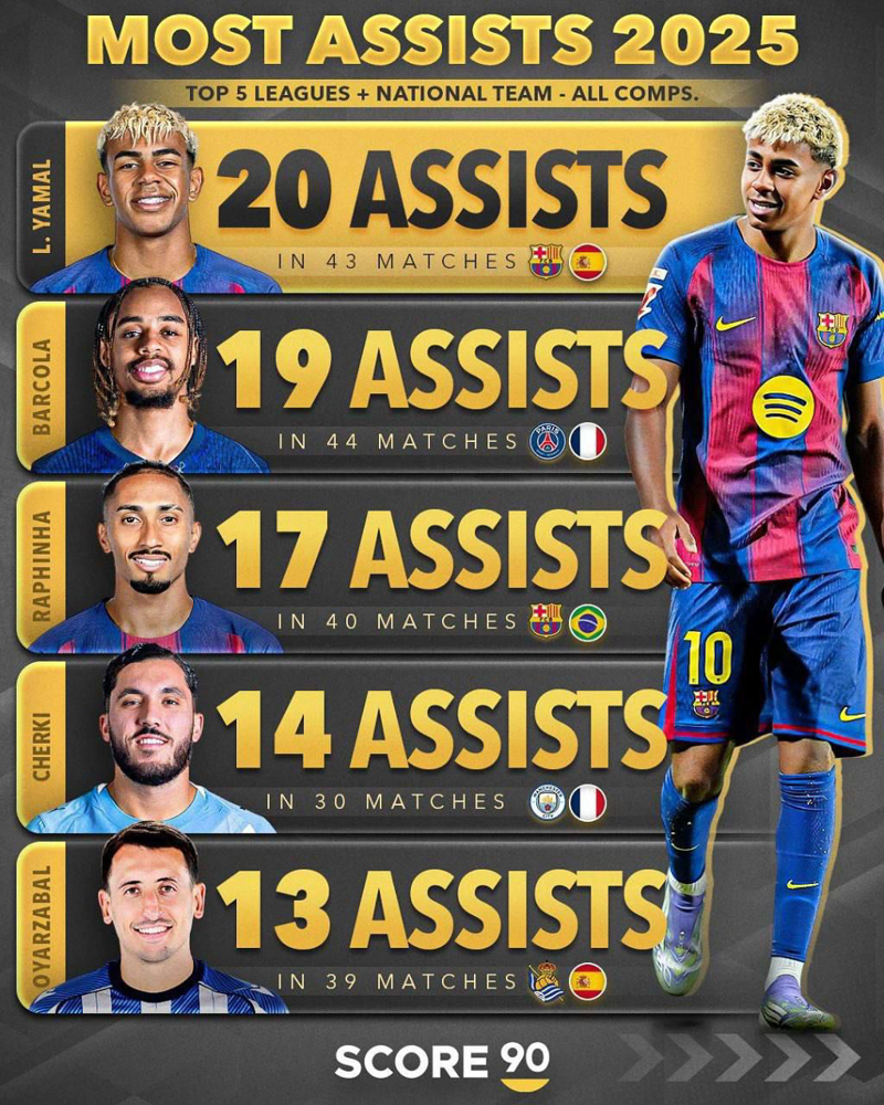 بیشترین پاس گل در رده ملی و باشگاهی در پنج لیگ معتبر.
