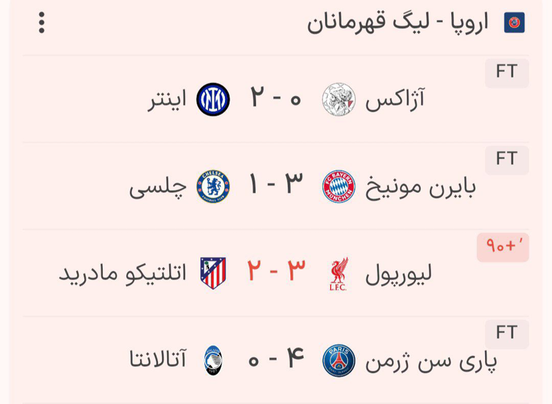 🏆 نتایج کامل مسابقات امشب لیگ قهرمانان اروپا
