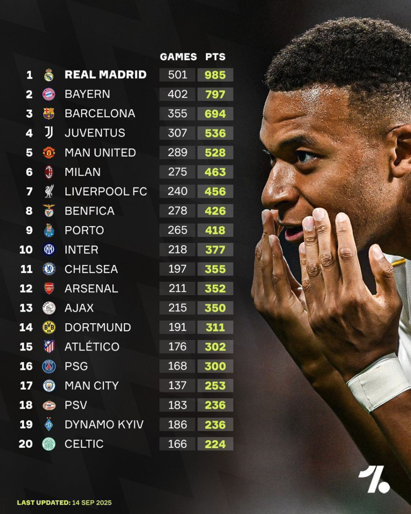 جدول امتیازی تاریخ لیگ قهرمانان اروپا