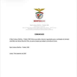 باشگاه بنفیکا طی نامه ای اعلام کرد مورینیو سرمربی این تیم شده.