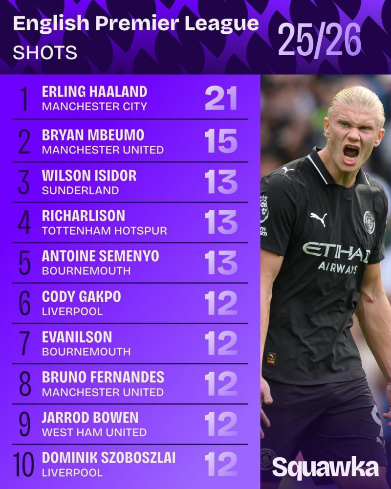 🔺 ارلینگ هالند با ۲۱ مورد، بیش از هر بازیکن دیگری در لیگ جزیره فصل۲۰۲۵/۲۶ اقدام به شوت‌زنی کرده است!