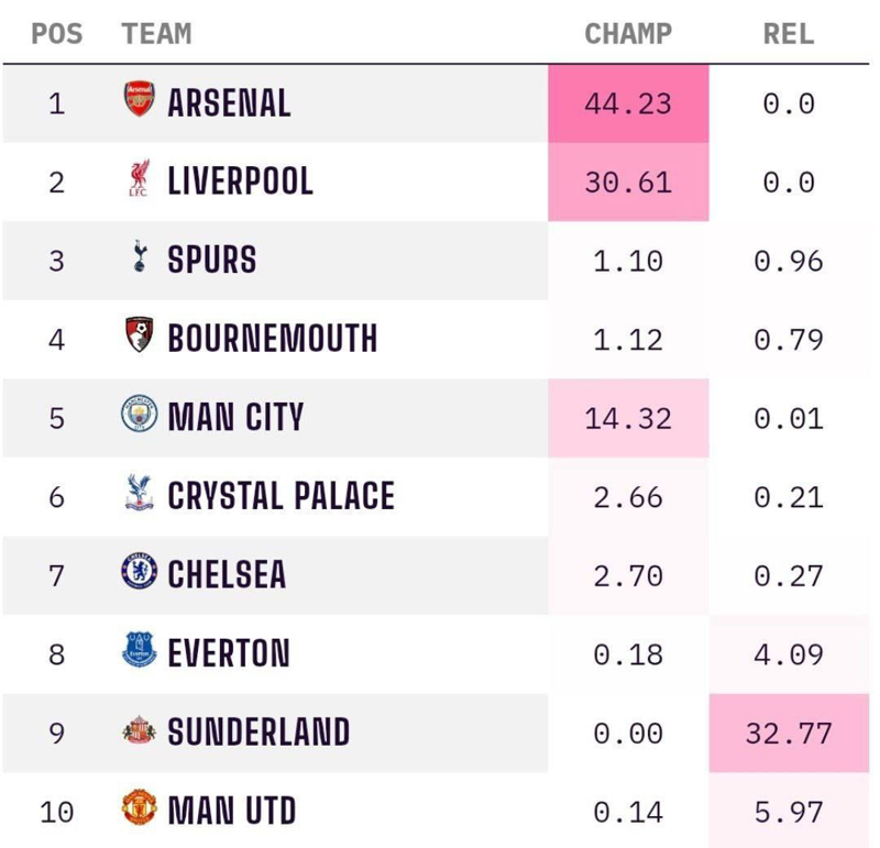 🥇 آرسنال بالاتر از لیورپول و منچسترسیتی، با احتمال ۴۴.۲۳٪ قهرمان لیگ برتر خواهد شد.