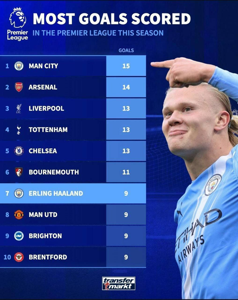 ⚡️ تنها ۶ تیم تا هفته هفتم لیگ برتر، بیشتر از هالند گل زده‌اند.