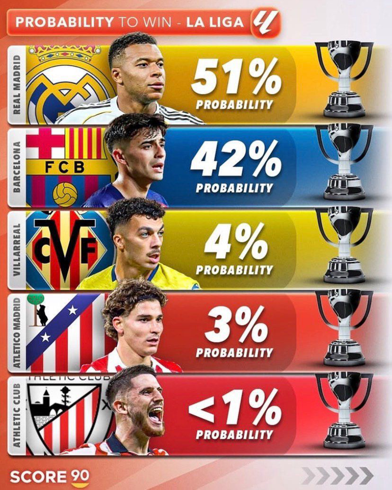 🔺شانس قهرمانی تیم‌های لالیگایی