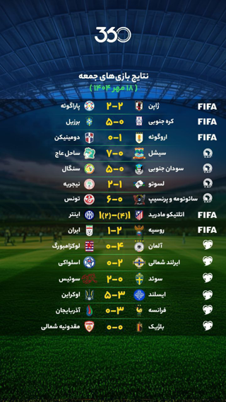 🔺نتایج مهم‌ترین بازی‌‌‌‌های جمعه ۱۸ مهر