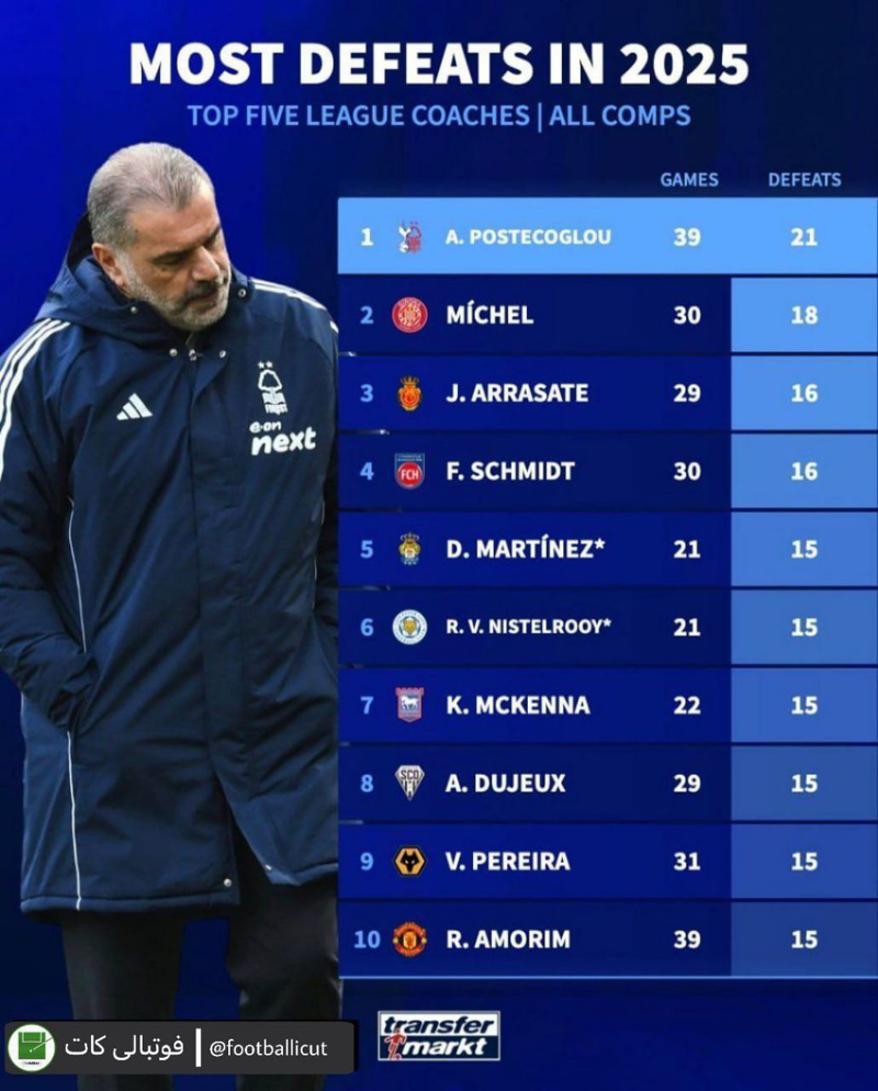 🔺سرمربیان ۵ لیگ معتبر با بیشترین شکست در سال ۲۰۲۵