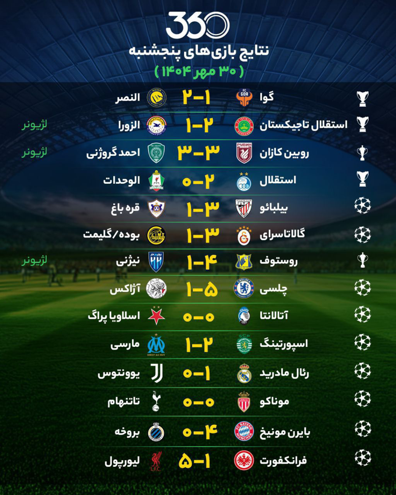 نتایج مهمترین بازیهای چهارشنبه ۳۰ مهر