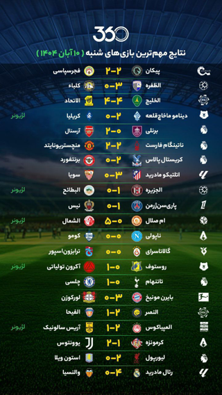 نتایج مهمترین بازیهای شنبه ۱۰ آبان