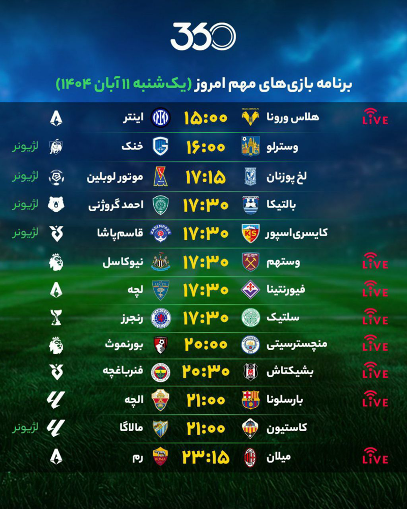برنامه بازیهای امروز یکشنبه ۱۱ آبان ۱۴۰۴