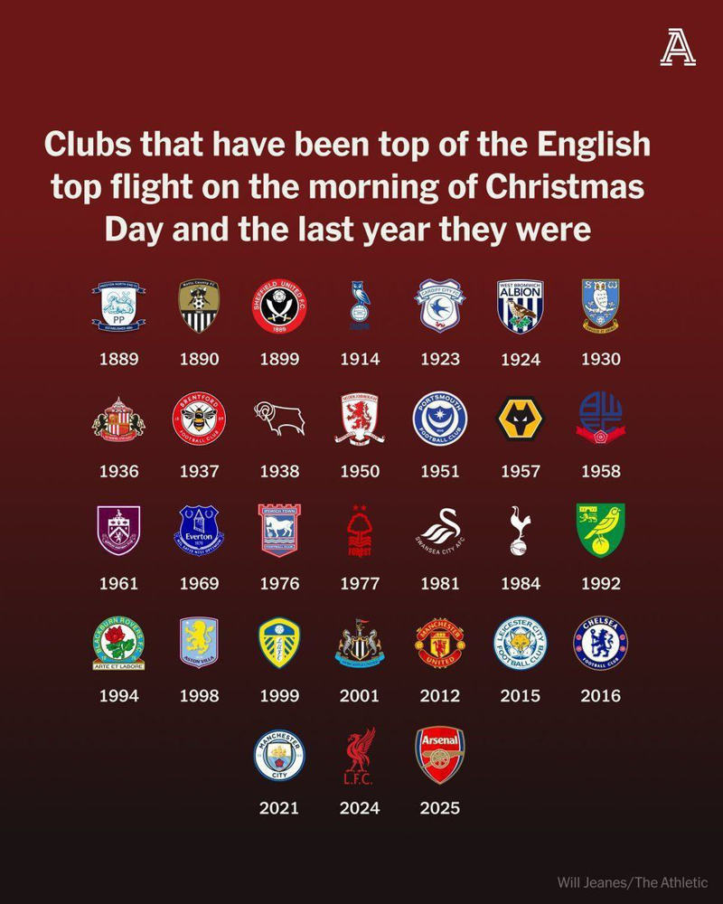 📊 آخرین صدرنشینی تیمهای انگلیسی در سطح اول فوتبال هنگام کریسمس.