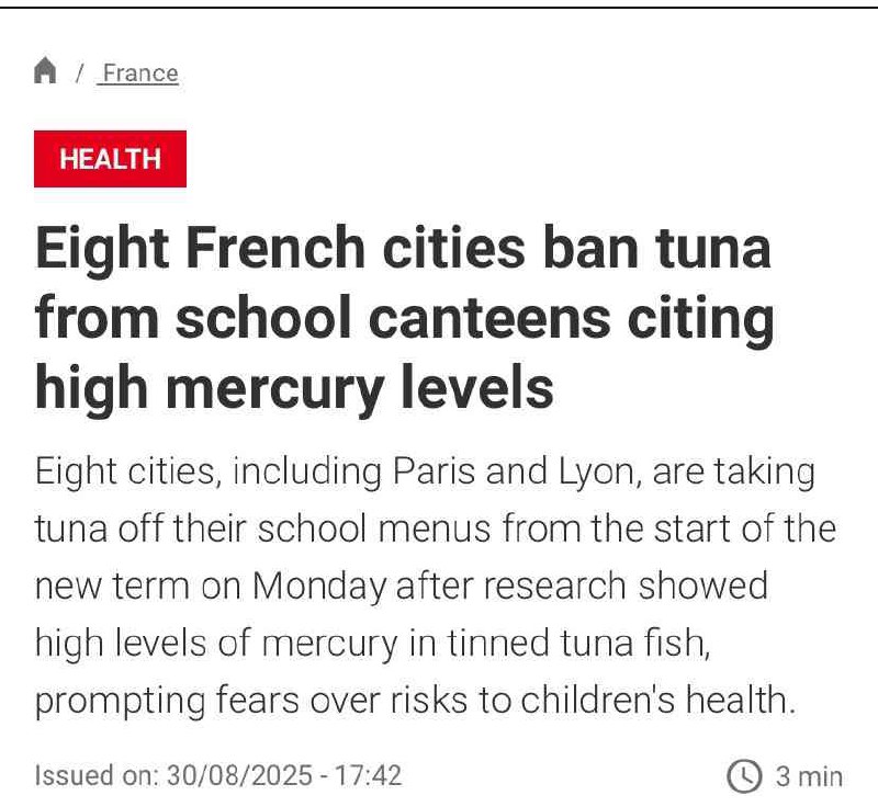 8 تا شهر در فرانسه موقتا مصرف تن ماهی رو برای غذای مدرسه‌ ممنوع کردن.