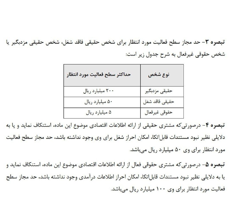 🔹طبق اطلاعیه بانک مرکزی؛ از این بعد مشتریان بانکی سطح بندی میشن و محدودیت فعالیت دارن. اشخاصی که شغل دارن؛ سالی ۲۰ میلیارد تومن و افرادی که شغل ندارن؛ سالی ۵ میلیارد تومن میتونن فعالیت داشته باشن و اگه واریز و برداشت