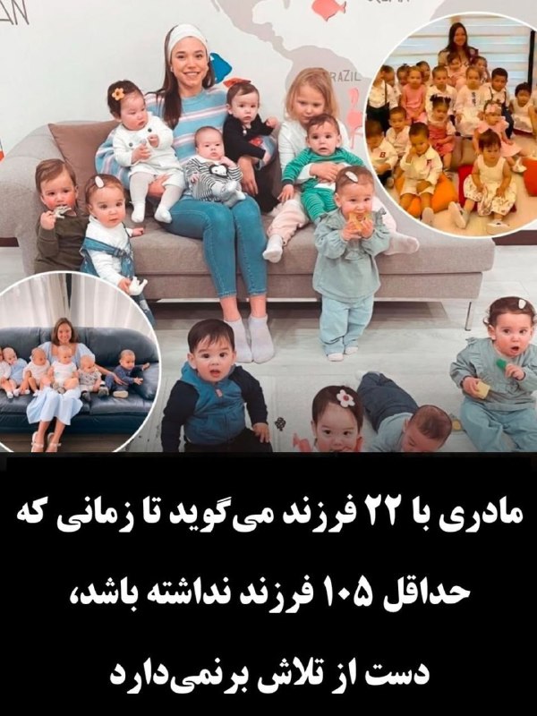 این خانم ۲۵ ساله روسی اعتیاد به فرزند آوردن داره، اون تا الان ۲۲ تا بچه بدنیا آورده ولی گفته تا جایی که بتونم میخوام ادامه بدم و تا به رکورد ۱۰۵ فرزند نرسم دست نمیکشم!