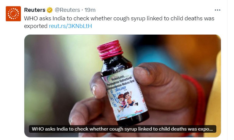 🔹رویترز: سازمان بهداشت جهانی از هند خواسته بررسی کند آیا شربت‌های سرفه تولیدی این کشور با مرگ ۱۷ کودک مرتبط است یا نه.