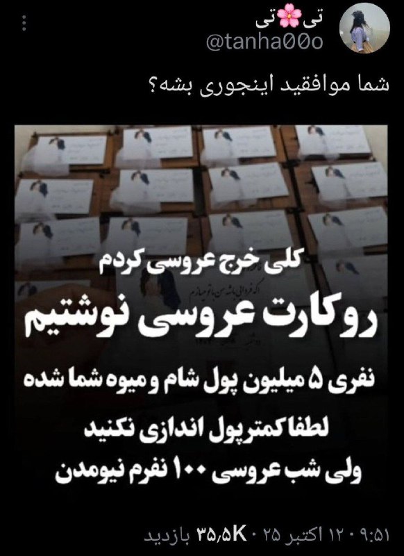 خدایش زشته روی کارت عروسی بنویسی نفری ۵ میلیون هزینه شام و میوه کردم شما هم همیقدر شاباش بدید 😂😂