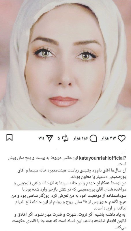 ۳ سال پیش کتایون ریاحی افشاگری کرد که سعیدپورصمیمی ۲۵ سال پیش به او تعرض کرده که البته وکیل پورصمیمی گفت که چون بدون سند و مدرک این حرف رو زده از دست او شکایت میکنیم