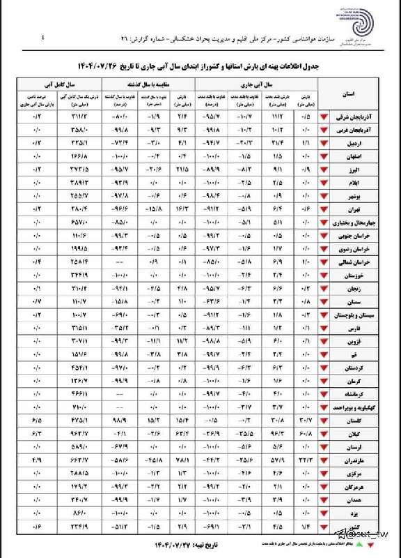 مهر داره تموم میشه و تقریباً به غیر از سه استان شمالی کشور هیچ جای کشور بارش نداشتیم و پیش بینی میشه تو آبان هم بارندگی قابل توجهی نداشته باشیم و از آذر ماه وضعیت بارشها بهتر میشه