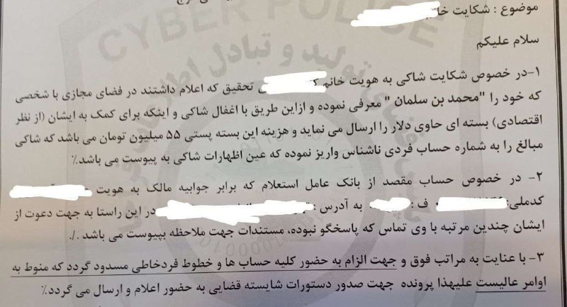 یه خانم تو تهران رفته از یه پسری که خودشو محمد بن سلمان، ولیعهد عربستان جا زده بود شکایت کرده حالا جریان چی بوده؟! پسره به این خانم پیام میده میگه من ولیعهد عربستانم میخوام واست کیف پر از دلار بفرستم ولی باید خودت پول ارسالشو بدی زنه هم ۵۵ میلیون توم