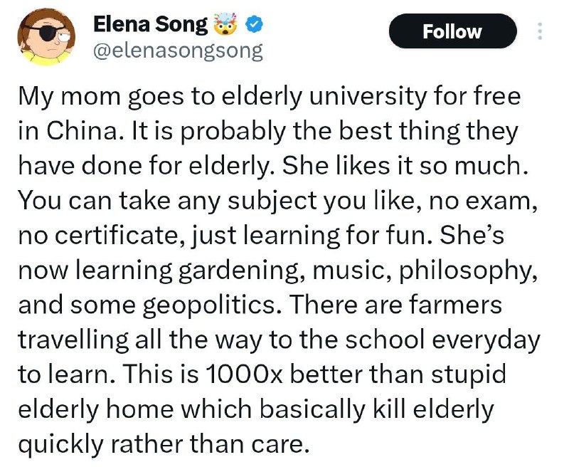 توی چین دانشگاه سالمندان درست کردن که رایگانه. هر درسی رو میشه خوند و هیچ امتحان و مدرکی در کار نیست. فقط برای ذوقش درس میخونی. این خانوم میگه مامانش به یکی از این دانشگاهها میره و خیلی لذت میبره. الان داره باغبانی یادمیگیره و فلسفه و خیلی چ