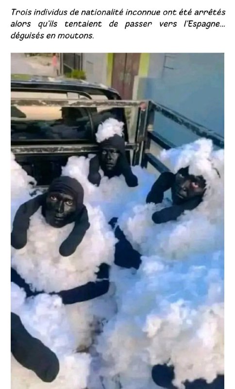 ۳ نفر با ملیت نامعلوم موقع تلاش برای عبور از مرز الجزایر، برای ورود به اسپانیا دستگیر شدند. این سسخلا خودشون رو به شکل گوسفند درآورده بودند بتونن از مرز رد شن