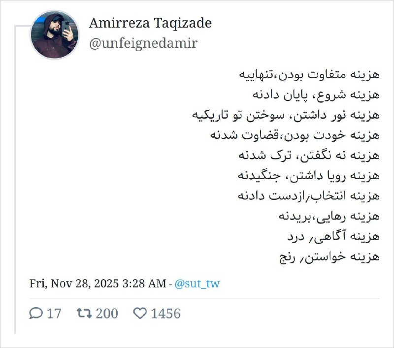 بنظرم یکی از خوشحال ترین ادما، اونان که میفهمن انتخاب هر مسیری توی زندگی هزینه داره…اخر داستان زیرش نمیزنن، نقش قربانی نمیگیرن و حقیقت رو واسه خودشون دستکاری نمیکنن.