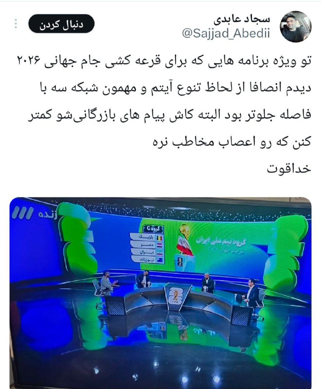 یک فعال رسانه‌ای: تو ویژه برنامه هایی که برای قرعه کشی جام‌ جهانی ۲۰۲۶ دیدم انصافا از لحاظ تنوع آیتم و مهمون شبکه سه با فاصله جلوتر بود البته کاش پیام های بازرگانی‌شو کمتر کنن که رو‌ اعصاب مخاطب نره