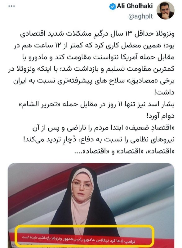 🔻علی قلهکی: ونزوئلا حداقل ۱۳ سال درگیرِ مشکلات شدید اقتصادی بود؛ همین معضل کاری کرد که کمتر از ۱۲ ساعت هم در مقابل حمله آمریکا نتواسنت مقاومت کند و مادورو با کمترین مقاومت تسلیم و بازداشت شد؛ با اینکه ونزوئلا در برخی «مصادیق» سلاح های پیشرفته‌تری نس
