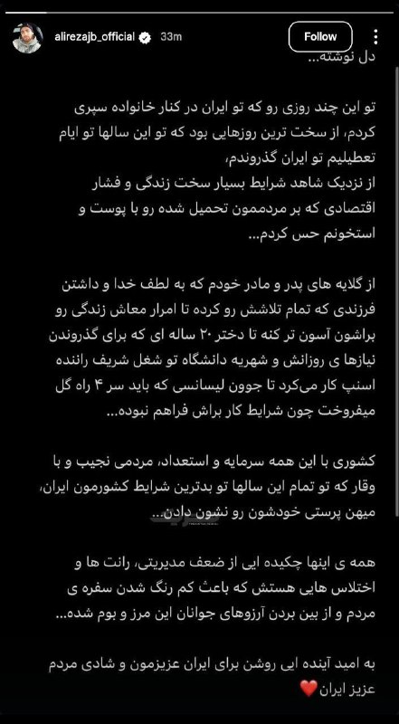 استوری اعتراضی علیرضا جهانبخش به وضعیت موجود