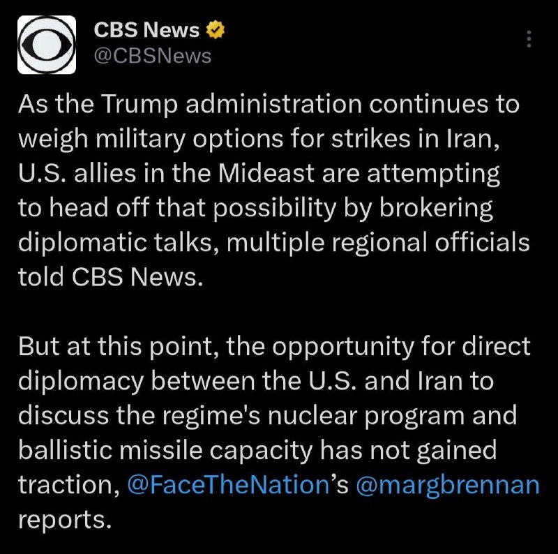 🔹چندین مقام منطقه‌ای به سی‌بی‌اس نیوز گفتند، در حالی که دولت ترامپ همچنان گزینه‌های نظامی برای حمله به ایران را بررسی می‌کند، متحدان ایالات متح