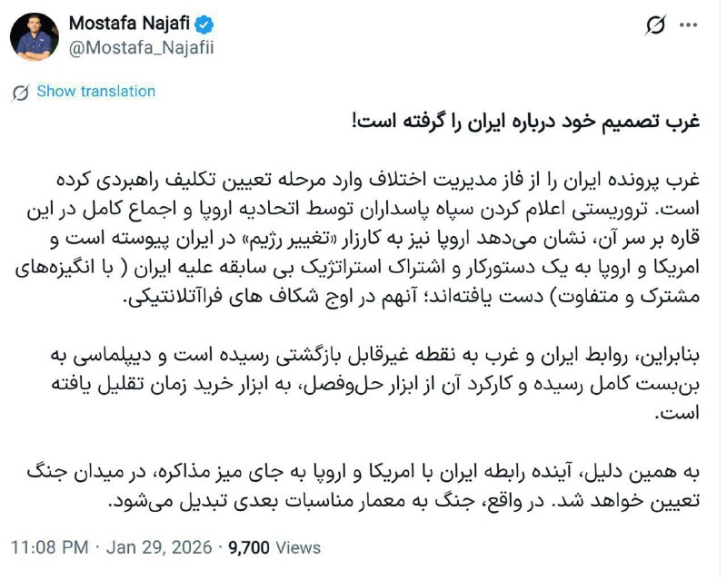 مشاور محسن رضایی: غرب تصمیم خود درباره ایران را گرفته است؛ ایران و‌غرب به نقطه غیرقابل بازگشتی رسیده اند و آینده روابط به جای میز مذاکره در میدان جنگ مشخص می‌شود