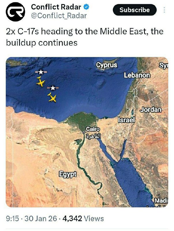 🔻کانفلیکت رادار: دو فروند هواپیمای C-17 آمریکا به سمت خاورمیانه در حرکت است.