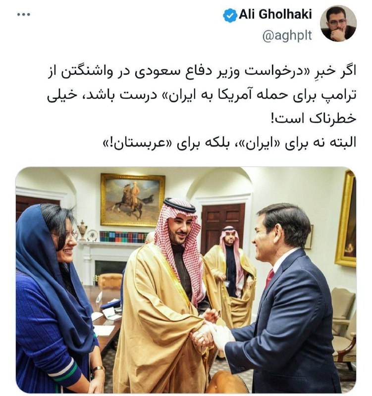 علی قلهکی: اگر خبرِ «درخواست وزیر دفاع سعودی در واشنگتن از ترامپ برای حمله آمریکا به ایران» درست باشد، خیلی خطرناک است!