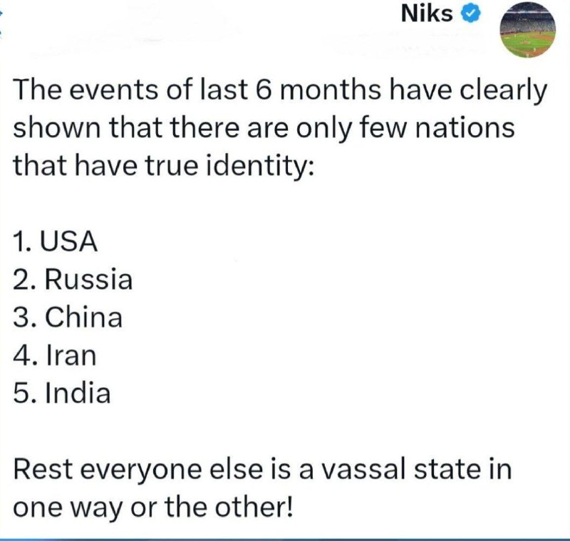 توییت کاربر خارجی: اتفاقات شش ماه اخیر نشان داد فقط پنج کشور هویت واقعی دارن: آمریکا، روسیه، چین، ایران و هند. بقیه کشورها در یک شکل یا شکل دیگه، دولتهای تابع و دستنشانده هستن