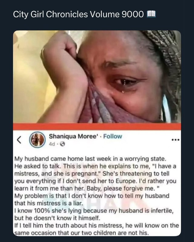 شوهرم هفته پیش اومد گفت که یک معشوقه داره که ازش حامله شده و گفته اگه منو نفرستی اروپا به همه میگم! شوهرش گفته خواسته اینو زودتر از من بشنوی نه اون! حالا زنه میگه نمیدونم چطوری به شوهرم بگم طرف داره دروغ میگه! چون شوهرم عقیمه! ولی اگه بهش بگم موضوع د