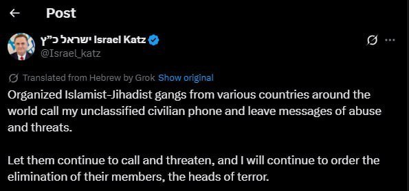 کاتز، وزیر جنگ اسرائیل: گروههای سازمانیافته جهادی از کشورهای مختلف جهان با تلفن غیرمحرمانه غیرنظامی من تماس میگیرند و پیامهای توهینآمیز و تهدیدآمیز میگذارند.