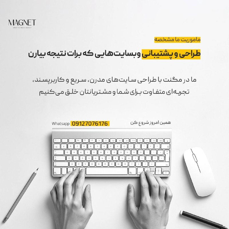 📌آژانس تبلیغاتی مگنت یک شرکت تمام دیجیتال مارکتینگ است که به شکل تخصصی در حوزه دیجیتال برندینگ، طراحی گرافیکی، ساخت تیزرهای تبلیغاتی، عکاسی، طراحی لوگو، طراحی و توسعه وبسایت و مدیریت شبکه های اجتماعی فعالیت میکند