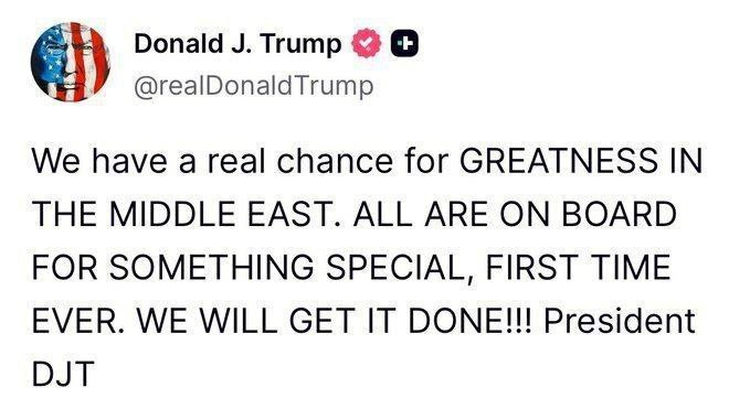 ما واقعاً یک فرصت تاریخی برای ایجاد عظمت در خاورمیانه داریم همه برای چیزی بی‌نظیر و برای اولین بار کنار هم هستند. باور دارم که این بار، ما این کار را