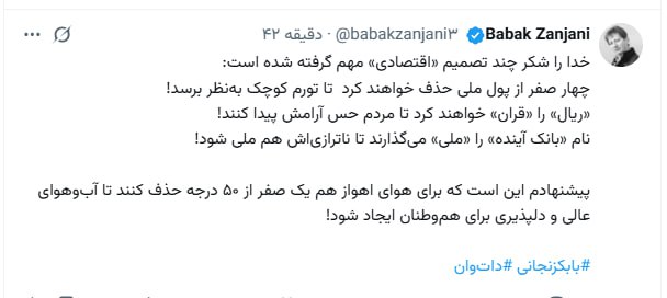 کنایه بابک زنجانی به مسئولین: حالا که برای کوچک کردن تورم چهار صفر از پول ملی حذف میکنید و نام بانک آینده را عوض میکنید تا ناترازیاش ملی شود، برای هوای اهواز هم یک صفر از ۵۰ درجه حذف کنند تا آبوهوای عالی و دلپذیری برای هموطنان ایجاد شود!