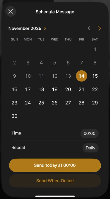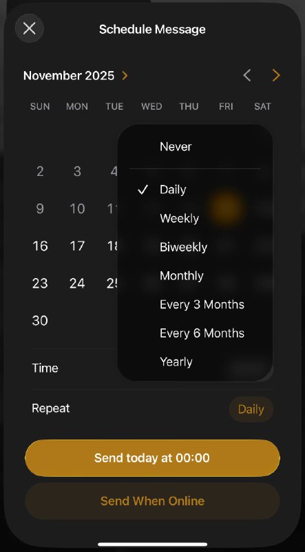 آپدیت جدید تلگرام منتشر شد و حالا می‌تونی یه پیام رو روی تکرار تنظیم کنی تا به‌صورت روزانه یا هفتگی و سرِ یه ساعت مشخص، خودش برای کاربر ارسال بشه.