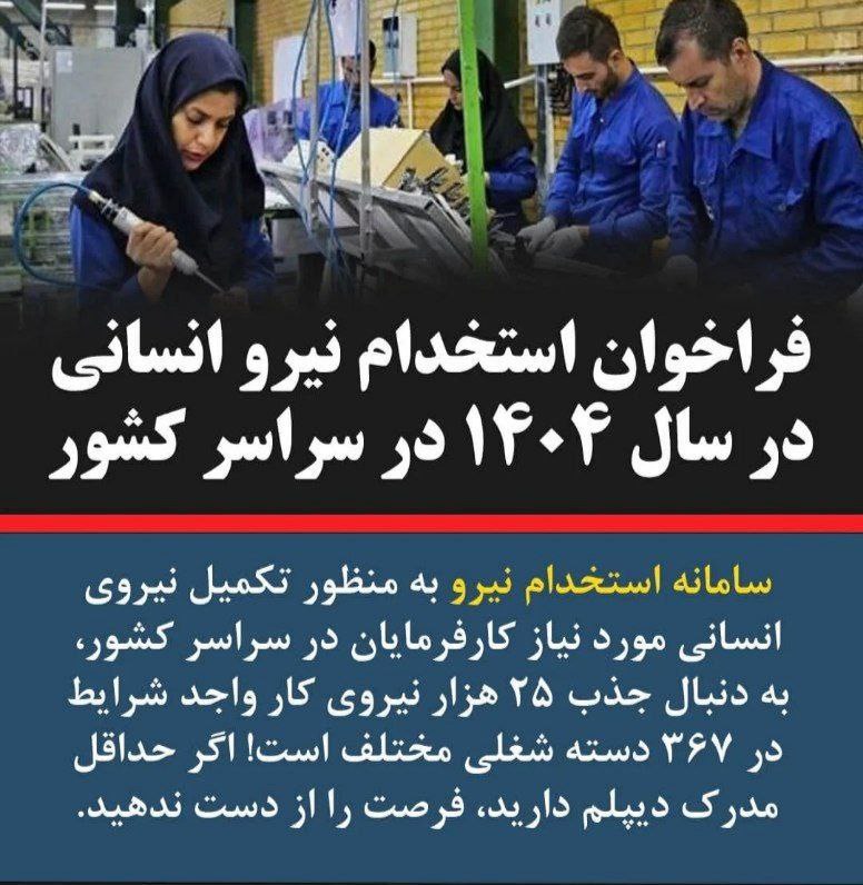 فراخوان استخدام نیرو نیمه دوم سال ۱۴۰۴ سامانه استخدام نیرو، در راستای ایجاد اشتغال برای جوانان متعهد و متخصص، در نیمه دوم سال ۱۴۰۴ جهت تامین نیروی کار درخواستی کارفرمایان از افراد واجد شرایط دعوت به همکاری مینماید.