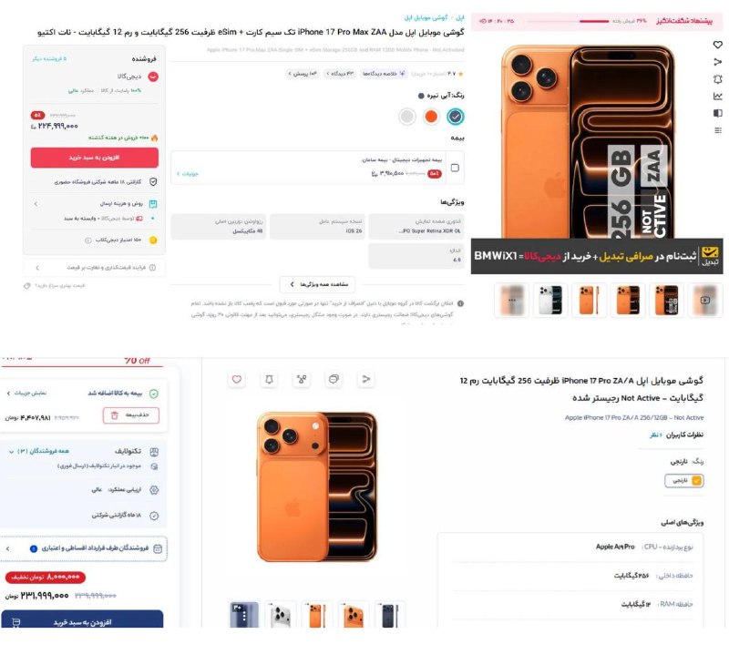 دیجیکالا: آیفون ۱۷ پرومکس + ایسیم با ظرفیت ۲۵۶ گیگابایت و رم ۱۲ گیگابایت: ۲۲۴.۹۹۹ تومان