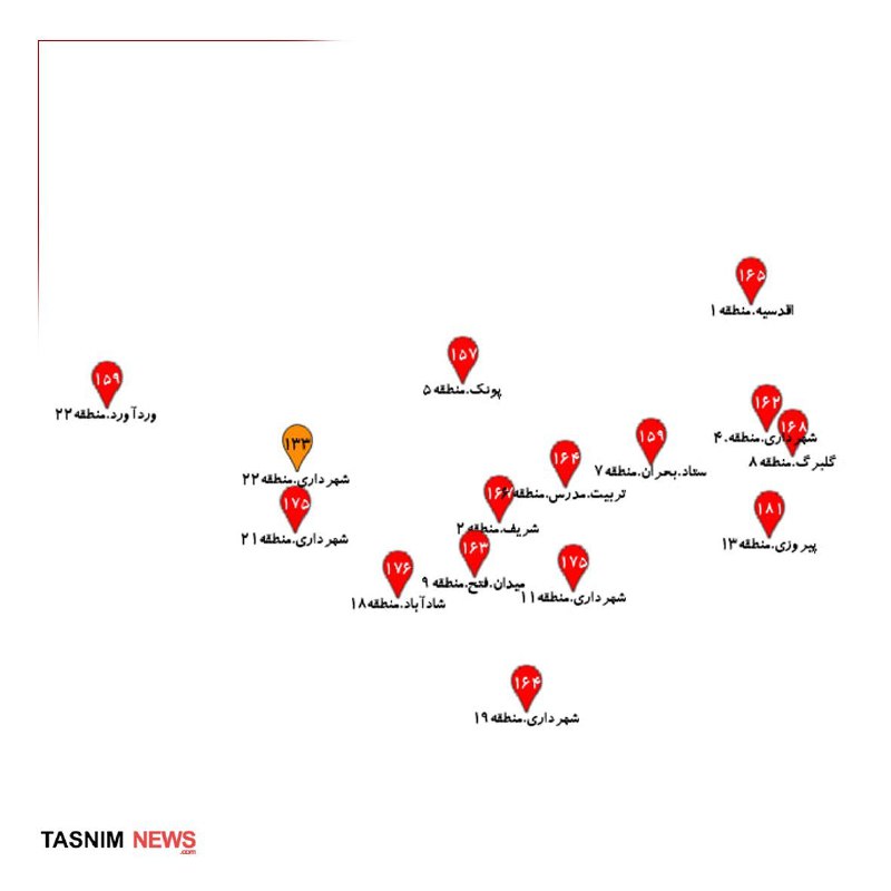 ◽️با توجه به نقشه تفکیکی پایگاههای سنجش آلودگی هوای تهران، شاخص آلودگی هوای پایتخت در خیابان پیروزی منطقه ۱۳ و ۱۴ تهران به عدد ۱۸۱ رسیده