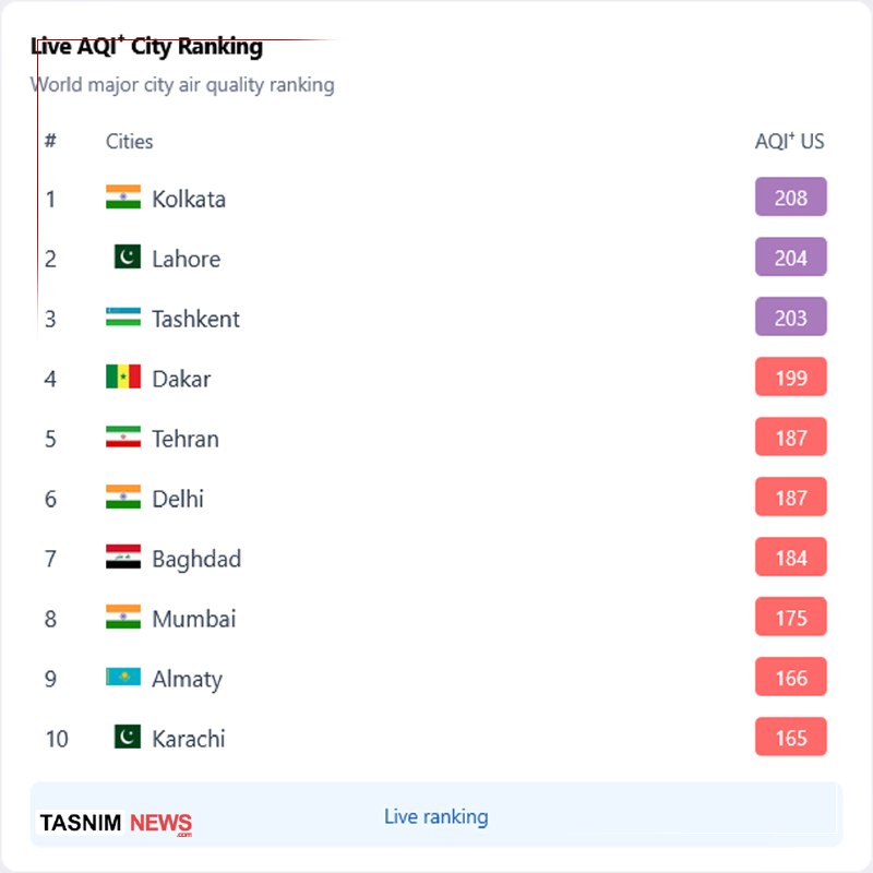 تهران در حال حاضر با شاخص ۱۸۷ در جایگاه پنجمین شهر آلوده جهان قرار دارد.