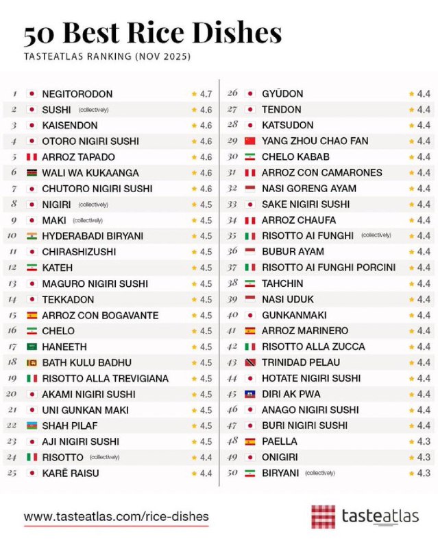 «کته»، «چلو»، «چلوکباب» و «ته‌چین» به‌‌ترتیب در جایگاه‌های دوازده، شانزده، سی و سی‌و‌هشتم بهترین غذاهای برنجی جهان در وب‌سایت TasteAtlas قرار گرفتند.