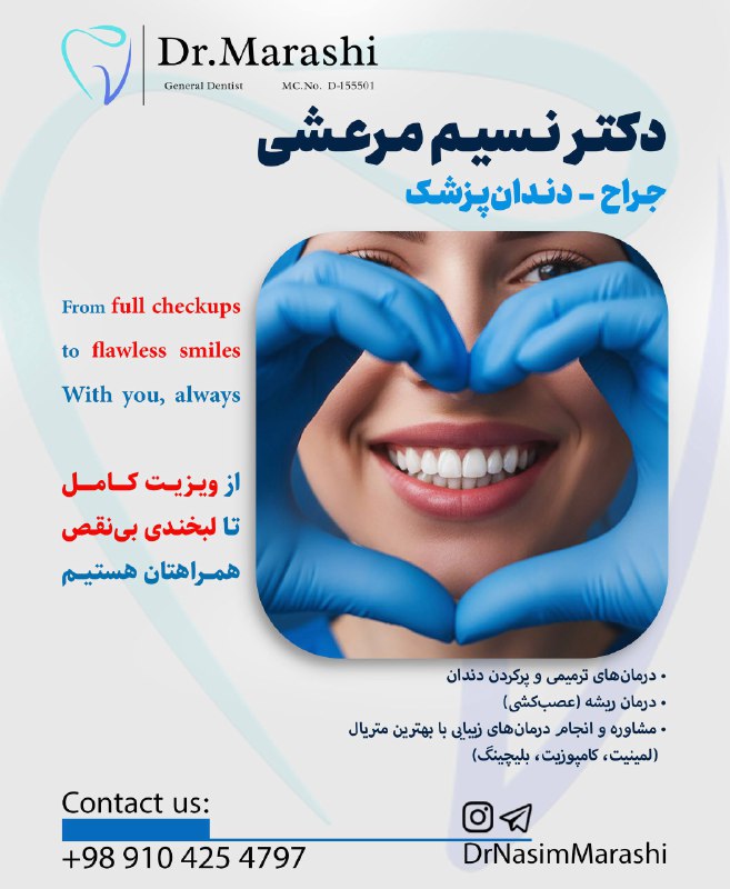 برای مشاورهٔ رایگان و ارتباط مستقیم با «دکتر مرعشی» و دریافت تعرفهٔ خدمات درمانی و زیبایی، از طریق آیدی زیر با ما در ارتباط باشید: