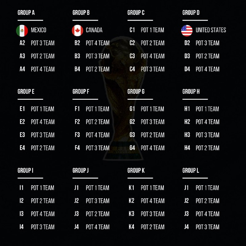 گروه A: مکزیک - آفریقای جنوبی - کره جنوبی - گروه B: کانادا - قطر - سوئیس گروه C: برزیل - مراکش - هائیتی - اسکاتلند گروه D: آمریکا - پاراگوئه - استرالیا گروه E: آلمان - کوراسائو - ساحل عاج - اکوادو