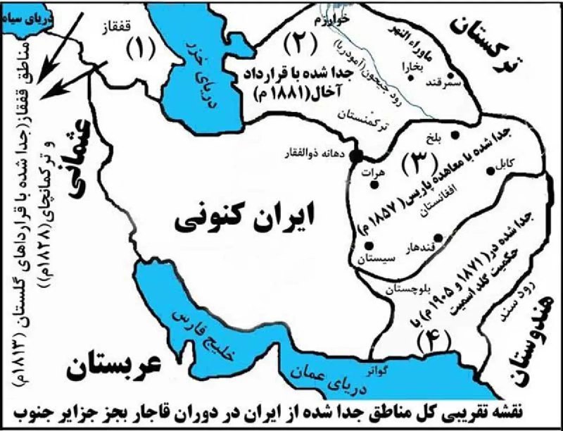 حالا که بحثش هست، دونستنش خالی از لطف نیست بعد از این همه سال کتاب تاریخ خوندن تو مدرسه، از رو نقشه بهتر میشه فهمید چه قسمت هایی و طی چه قراردادهایی از ایران جدا شدن