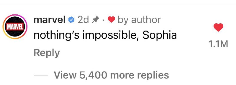 یه دختر به اسم سوفیا تو اینستاگرام به مادرش میگه در چه صورت اجازه میدی برای کریسمس یه سگ کوچولو بیارم ؟ مامانش میگه اگه ۵۰۰ هزار تا لایک بگیری و مارولم لایکت کنه این پست در اینستاگرام بیشتر از یک ملیون لایک گرفته و اینم ماول که براش کامنت گذاشته 😍