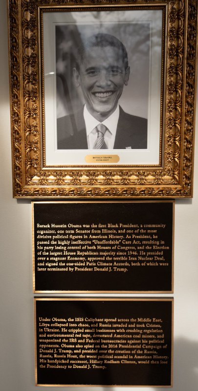 لعنت بهت ترامپ :))) زیر عکس اوباما تو کاخ سفید نوشت سیاستهایش باعث تضعیف اقتصاد، گسترش بیثباتی در خاورمیانه، قدرتگیری داعش، بحران در لیبی، تصرف کریمه توسط روسیه، توافق هستهای ایران و توافق اقلیمی پاریس شد! زیر عکس ریگان هم نوشته، ریگان طرفدار تر